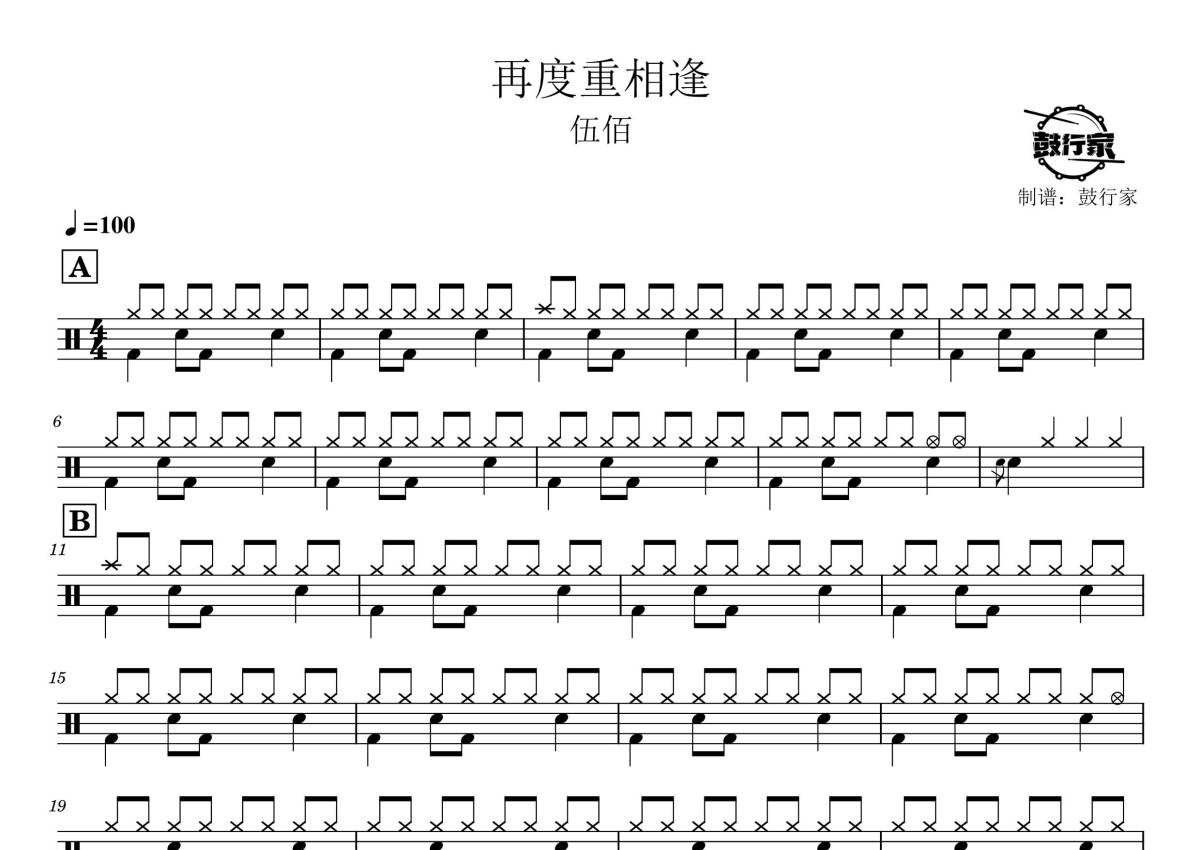《再度重相逢》是伍佰演唱的一首歌曲,拍号为4/4拍,歌曲速度为每分钟100拍,这份鼓谱共有两张高清图谱,图谱由 @鼓行家 编配上传,图谱使用五线谱编配,使用这份再度重相逢架子鼓谱,你将能够轻松地敲打出这首伍佰的再度重相逢,快来尝试吧。