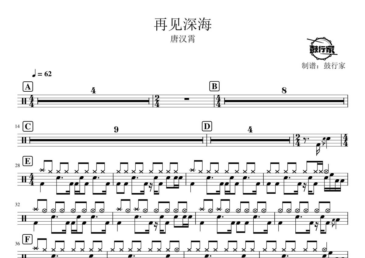 《再见深海》是唐汉霄演唱的一首歌曲,拍号为4/4拍,歌曲速度为每分钟62拍,这份鼓谱共有一张高清图谱,图谱由 @鼓行家 编配上传,图谱使用五线谱编配,使用这份再见深海架子鼓谱,你将能够轻松地敲打出这首唐汉霄的再见深海,快来尝试吧。