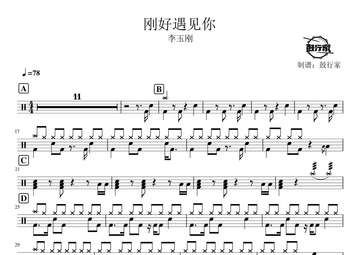 《刚好遇见你》是李玉刚演唱的一首歌曲,拍号为4/4拍,歌曲速度为每分钟78拍,这份鼓谱共有一张高清图谱,图谱由 @鼓行家 编配上传,图谱使用五线谱编配,使用这份刚好遇见你架子鼓谱,你将能够轻松地敲打出这首李玉刚的刚好遇见你,快来尝试吧。