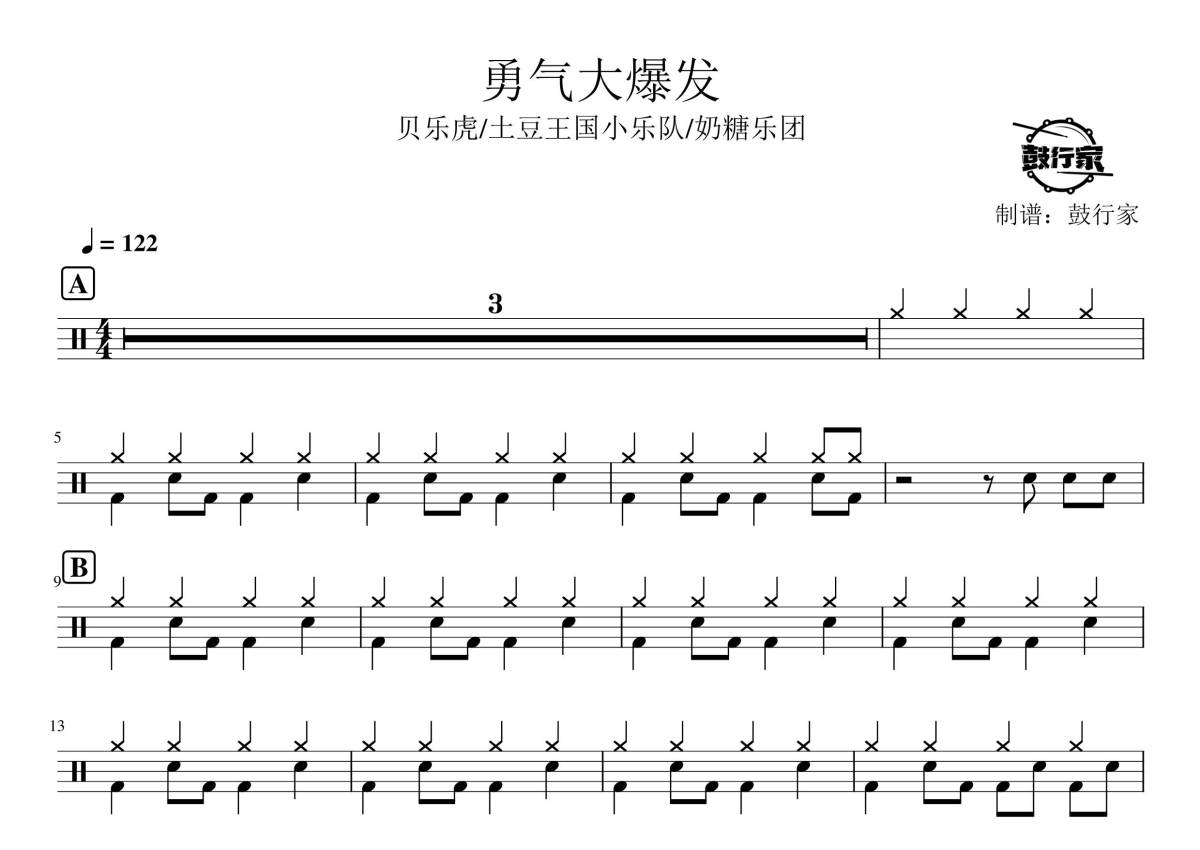《勇气大爆发》是贝乐虎/奶糖乐团/土豆王国小乐队演唱的一首歌曲,拍号为4/4拍,歌曲速度为每分钟122拍,这份鼓谱共有两张高清图谱,图谱由 @鼓行家 编配上传,图谱使用五线谱编配,使用这份勇气大爆发架子鼓谱,你将能够轻松地敲打出这首贝乐虎/奶糖乐团/土豆王国小乐队的勇气大爆发,快来尝试吧。