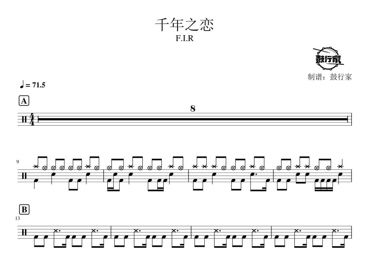 《千年之恋》是飞儿乐团演唱的一首歌曲,拍号为4/4拍,歌曲速度为每分钟71.5拍,这份鼓谱共有两张高清图谱,图谱由 @鼓行家 编配上传,图谱使用五线谱编配,使用这份千年之恋架子鼓谱,你将能够轻松地敲打出这首飞儿乐团的千年之恋,快来尝试吧。