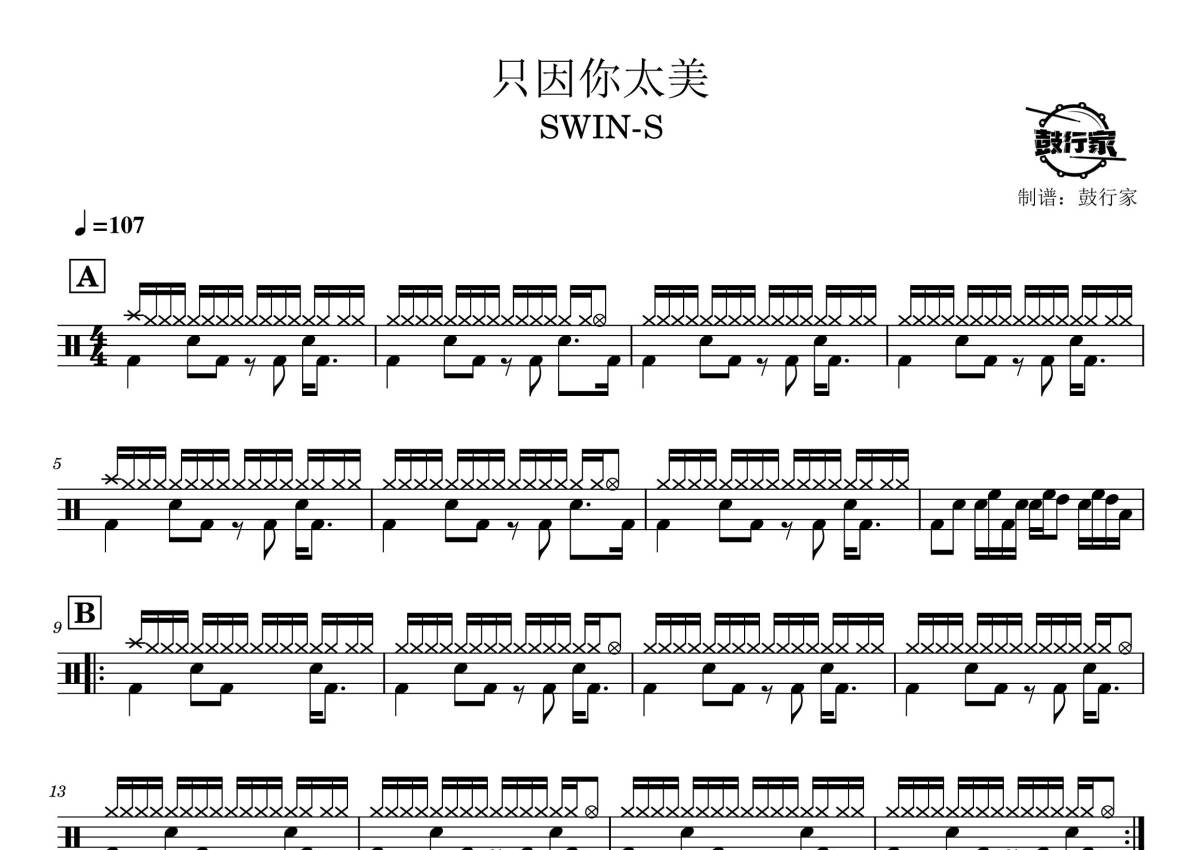 《只因你太美》是SWIN-S演唱的一首歌曲,拍号为4/4拍,歌曲速度为每分钟107拍,这份鼓谱共有两张高清图谱,图谱由 @鼓行家 编配上传,图谱使用五线谱编配,使用这份只因你太美架子鼓谱,你将能够轻松地敲打出这首SWIN-S的只因你太美,快来尝试吧。