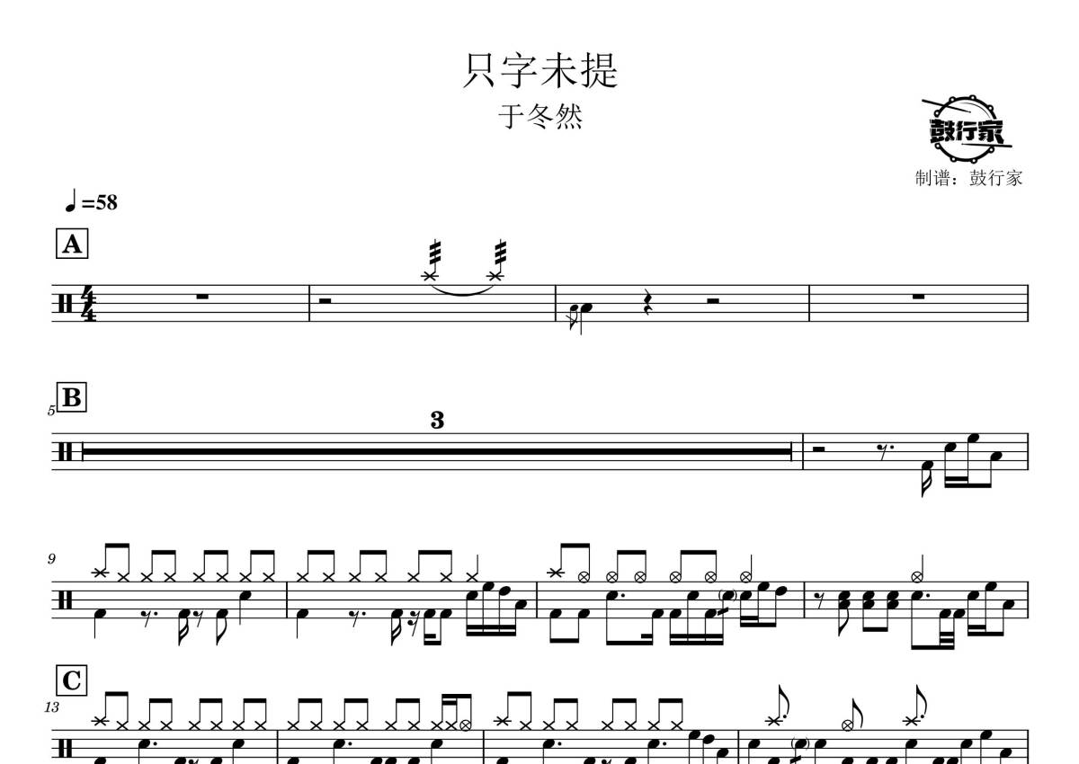 《只字未提》是于冬然演唱的一首歌曲,拍号为4/4拍,歌曲速度为每分钟58拍,这份鼓谱共有两张高清图谱,图谱由 @鼓行家 编配上传,图谱使用五线谱编配,使用这份只字未提架子鼓谱,你将能够轻松地敲打出这首于冬然的只字未提,快来尝试吧。