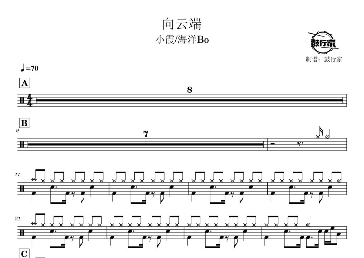 《向云端》是小霞/海洋BO演唱的一首歌曲,拍号为4/4拍,歌曲速度为每分钟70拍,这份鼓谱共有两张高清图谱,图谱由 @鼓行家 编配上传,图谱使用五线谱编配,使用这份向云端架子鼓谱,你将能够轻松地敲打出这首小霞/海洋BO的向云端,快来尝试吧。