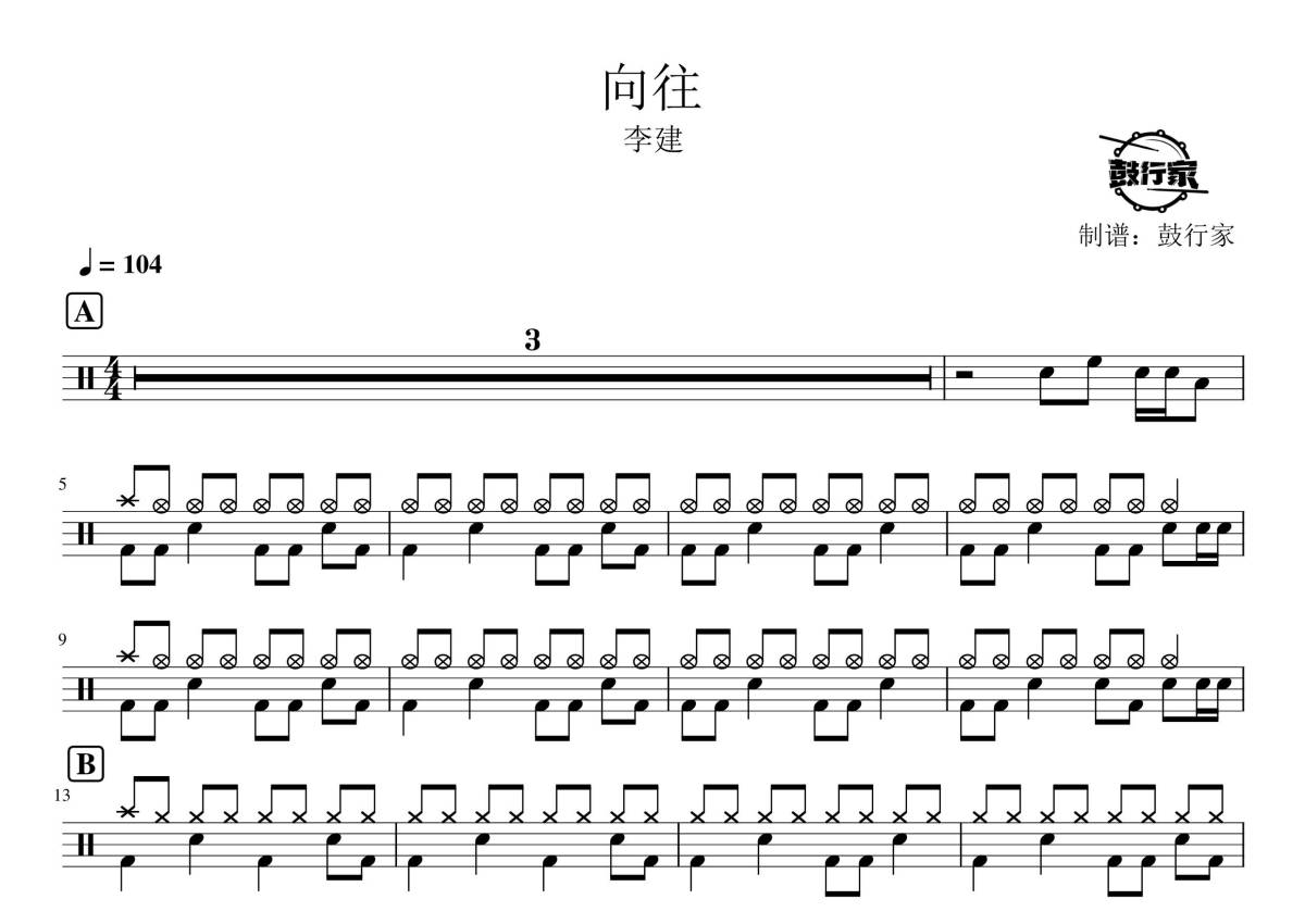 《向往》是李健演唱的一首歌曲,拍号为4/4拍,歌曲速度为每分钟104拍,这份鼓谱共有三张高清图谱,图谱由 @鼓行家 编配上传,图谱使用五线谱编配,使用这份向往架子鼓谱,你将能够轻松地敲打出这首李健的向往,快来尝试吧。