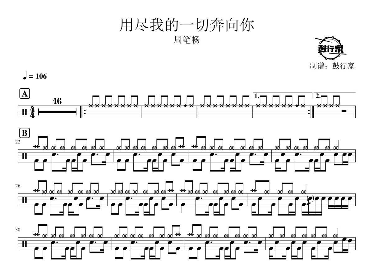 《用尽我的一切奔向你》是周笔畅演唱的一首歌曲,拍号为4/4拍,歌曲速度为每分钟106拍,这份鼓谱共有两张高清图谱,图谱由 @鼓行家 编配上传,图谱使用五线谱编配,使用这份用尽我的一切奔向你架子鼓谱,你将能够轻松地敲打出这首周笔畅的用尽我的一切奔向你,快来尝试吧。
