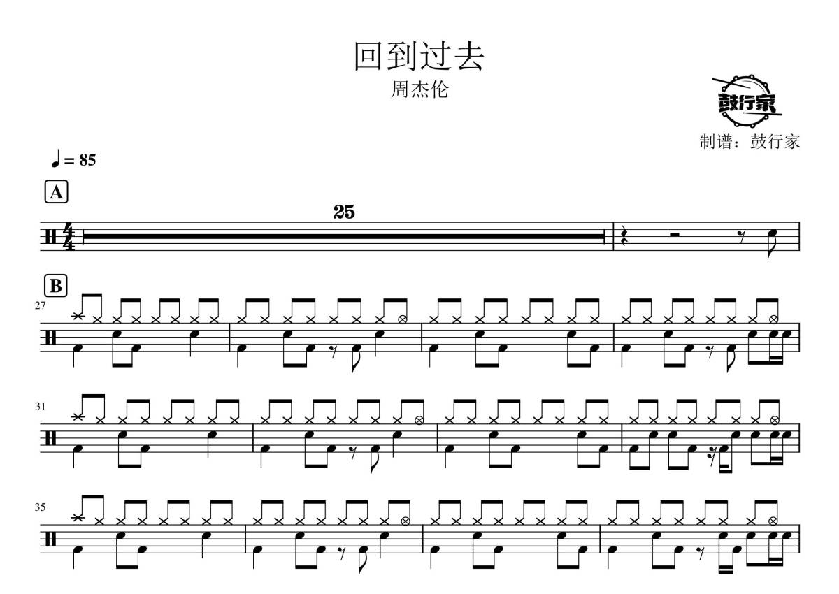 《回到过去》是周杰伦演唱的一首歌曲,拍号为4/4拍,歌曲速度为每分钟85拍,这份鼓谱共有一张高清图谱,图谱由 @鼓行家 编配上传,图谱使用五线谱编配,使用这份回到过去架子鼓谱,你将能够轻松地敲打出这首周杰伦的回到过去,快来尝试吧。