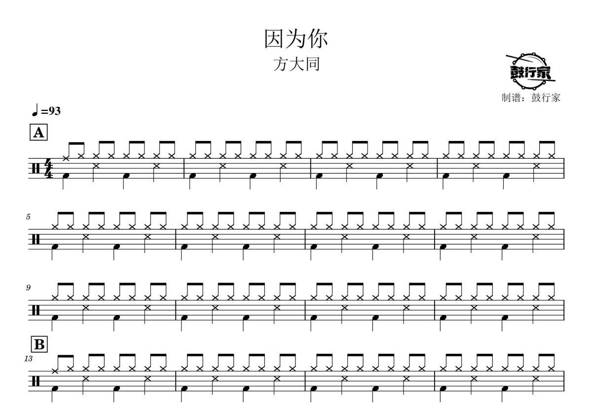 《因为你》是方大同演唱的一首歌曲,拍号为4/4拍,歌曲速度为每分钟93拍,这份鼓谱共有两张高清图谱,图谱由 @鼓行家 编配上传,图谱使用五线谱编配,使用这份因为你架子鼓谱,你将能够轻松地敲打出这首方大同的因为你,快来尝试吧。