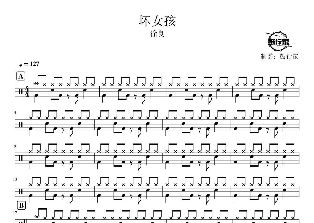 《坏女孩》是徐良演唱的一首歌曲,拍号为4/4拍,歌曲速度为每分钟127拍,这份鼓谱共有两张高清图谱,图谱由 @鼓行家 编配上传,图谱使用五线谱编配,使用这份坏女孩架子鼓谱,你将能够轻松地敲打出这首徐良的坏女孩,快来尝试吧。