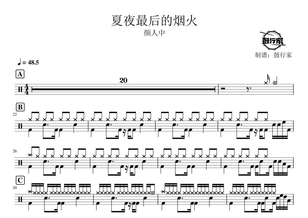 颜人中《夏夜最后的烟火》鼓谱 - 架子鼓谱