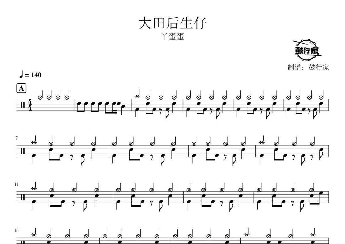 《大田后生仔》是丫蛋蛋演唱的一首歌曲,拍号为4/4拍,歌曲速度为每分钟140拍,这份鼓谱共有三张高清图谱,图谱由 @鼓行家 编配上传,图谱使用五线谱编配,使用这份大田后生仔架子鼓谱,你将能够轻松地敲打出这首丫蛋蛋的大田后生仔,快来尝试吧。