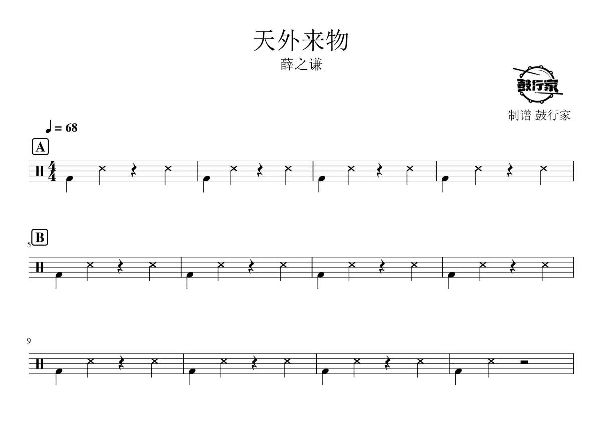 《天外来物》是薛之谦演唱的一首歌曲,拍号为4/4拍,歌曲速度为每分钟68拍,这份鼓谱共有两张高清图谱,图谱由 @鼓行家 编配上传,图谱使用五线谱编配,使用这份天外来物架子鼓谱,你将能够轻松地敲打出这首薛之谦的天外来物,快来尝试吧。