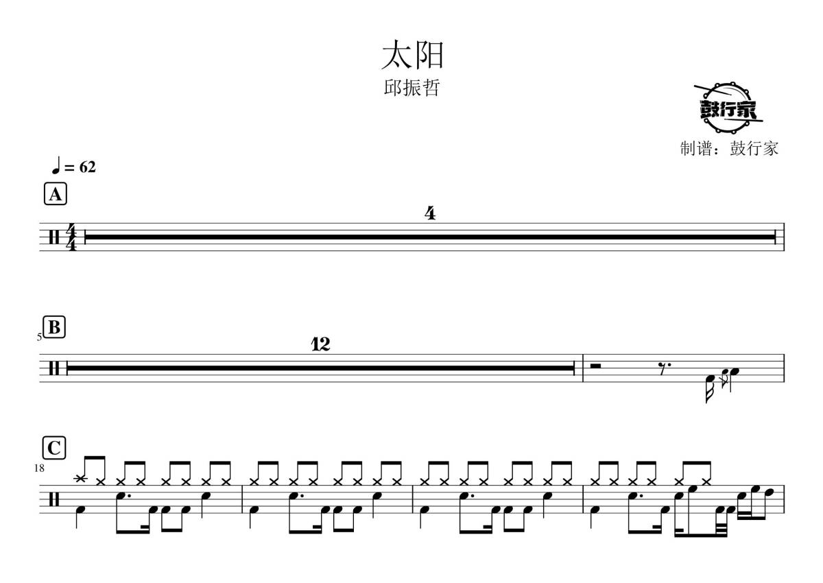 《太阳》是邱振哲演唱的一首歌曲,拍号为4/4拍,歌曲速度为每分钟62拍,这份鼓谱共有两张高清图谱,图谱由 @鼓行家 编配上传,图谱使用五线谱编配,使用这份太阳架子鼓谱,你将能够轻松地敲打出这首邱振哲的太阳,快来尝试吧。