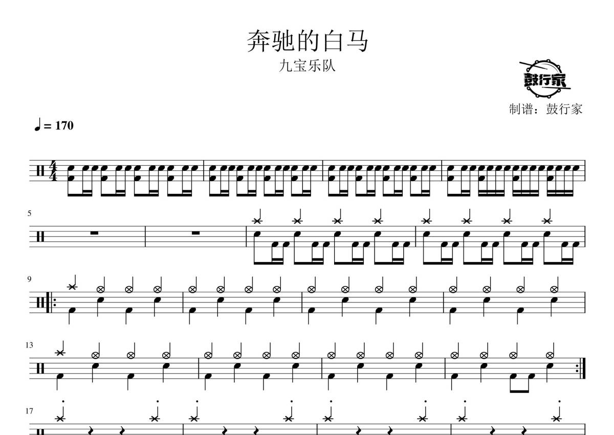 《奔驰的白马》是九宝乐队演唱的一首歌曲,拍号为4/4拍,歌曲速度为每分钟170拍,这份鼓谱共有三张高清图谱,图谱由 @鼓行家 编配上传,图谱使用五线谱编配,使用这份奔驰的白马架子鼓谱,你将能够轻松地敲打出这首九宝乐队的奔驰的白马,快来尝试吧。