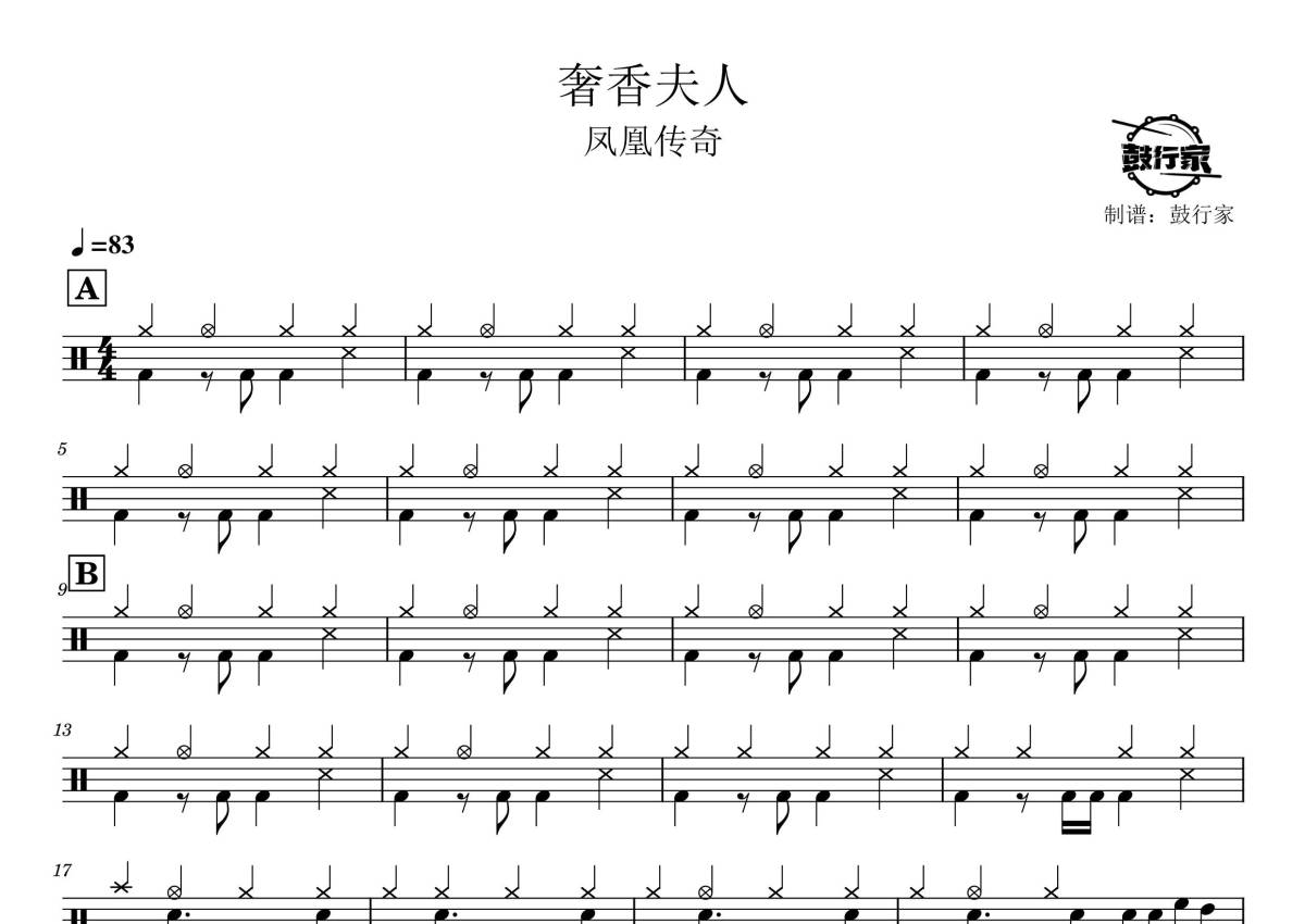 《奢香夫人》是凤凰传奇演唱的一首歌曲,拍号为4/4拍,歌曲速度为每分钟83拍,这份鼓谱共有两张高清图谱,图谱由 @鼓行家 编配上传,图谱使用五线谱编配,使用这份奢香夫人架子鼓谱,你将能够轻松地敲打出这首凤凰传奇的奢香夫人,快来尝试吧。