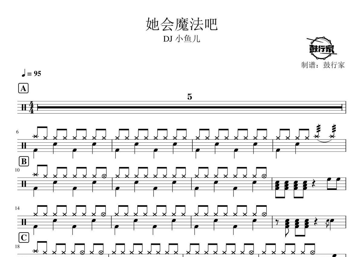 《她会魔法吧》是DJ小鱼儿演唱的一首歌曲,拍号为4/4拍,歌曲速度为每分钟95拍,这份鼓谱共有两张高清图谱,图谱由 @鼓行家 编配上传,图谱使用五线谱编配,使用这份她会魔法吧架子鼓谱,你将能够轻松地敲打出这首DJ小鱼儿的她会魔法吧,快来尝试吧。