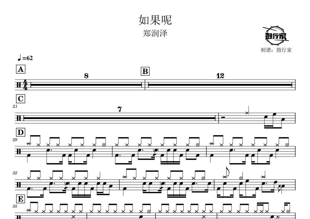 《如果呢》是郑润泽演唱的一首歌曲,拍号为4/4拍,歌曲速度为每分钟62拍,这份鼓谱共有一张高清图谱,图谱由 @鼓行家 编配上传,图谱使用五线谱编配,使用这份如果呢架子鼓谱,你将能够轻松地敲打出这首郑润泽的如果呢,快来尝试吧。