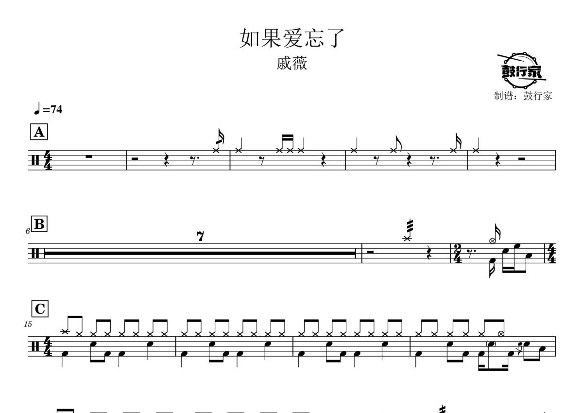 《如果爱忘了》是戚薇演唱的一首歌曲,拍号为4/4拍,歌曲速度为每分钟74拍,这份鼓谱共有两张高清图谱,图谱由 @鼓行家 编配上传,图谱使用五线谱编配,使用这份如果爱忘了架子鼓谱,你将能够轻松地敲打出这首戚薇的如果爱忘了,快来尝试吧。