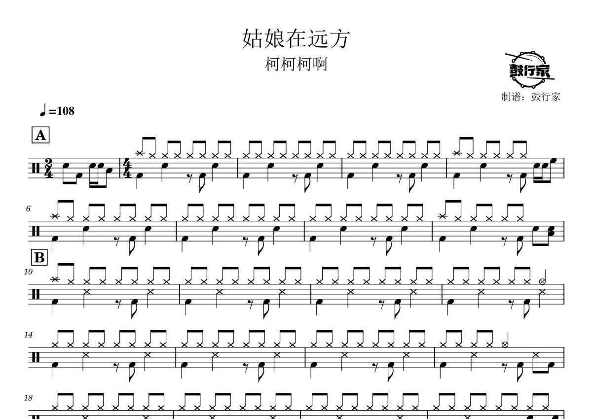《姑娘在远方》是柯柯柯啊演唱的一首歌曲,拍号为4/4拍,歌曲速度为每分钟108拍,这份鼓谱共有两张高清图谱,图谱由 @鼓行家 编配上传,图谱使用五线谱编配,使用这份姑娘在远方架子鼓谱,你将能够轻松地敲打出这首柯柯柯啊的姑娘在远方,快来尝试吧。