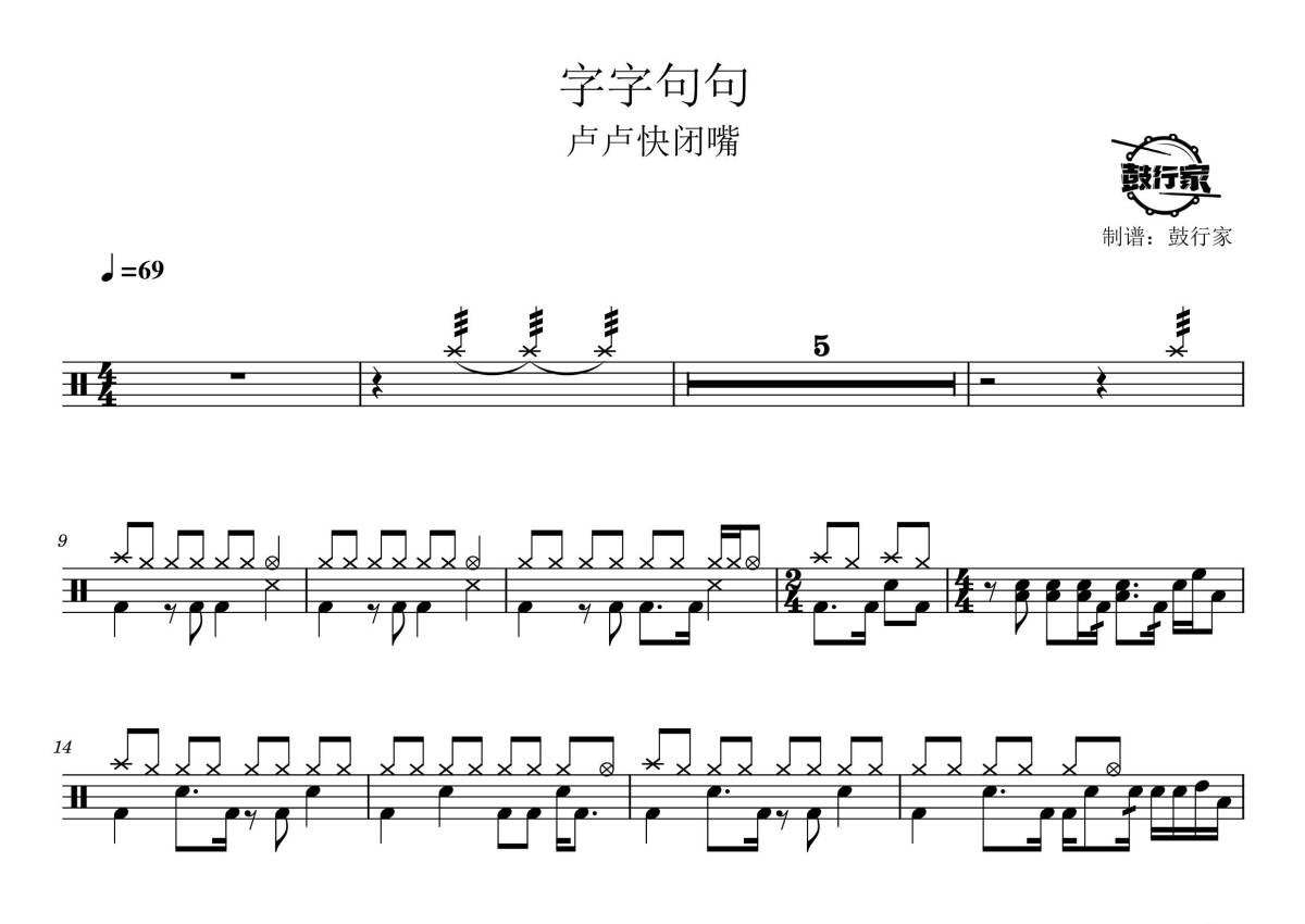 《字字句句》是卢卢快闭嘴演唱的一首歌曲,拍号为4/4拍,歌曲速度为每分钟69拍,这份鼓谱共有两张高清图谱,图谱由 @鼓行家 编配上传,图谱使用五线谱编配,使用这份字字句句架子鼓谱,你将能够轻松地敲打出这首卢卢快闭嘴的字字句句,快来尝试吧。