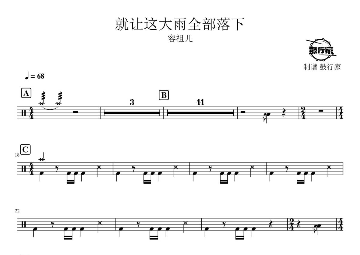 《就让这大雨全部落下》是容祖儿演唱的一首歌曲,拍号为4/4拍,歌曲速度为每分钟68拍,这份鼓谱共有两张高清图谱,图谱由 @鼓行家 编配上传,图谱使用五线谱编配,使用这份就让这大雨全部落下架子鼓谱,你将能够轻松地敲打出这首容祖儿的就让这大雨全部落下,快来尝试吧。