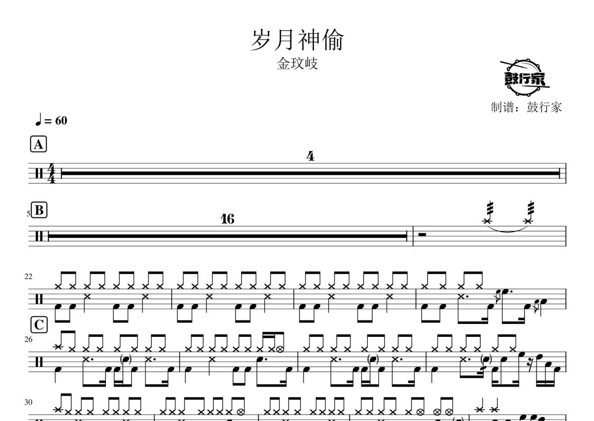 《岁月神偷》是金玟岐演唱的一首歌曲,拍号为4/4拍,歌曲速度为每分钟60拍,这份鼓谱共有一张高清图谱,图谱由 @鼓行家 编配上传,图谱使用五线谱编配,使用这份岁月神偷架子鼓谱,你将能够轻松地敲打出这首金玟岐的岁月神偷,快来尝试吧。