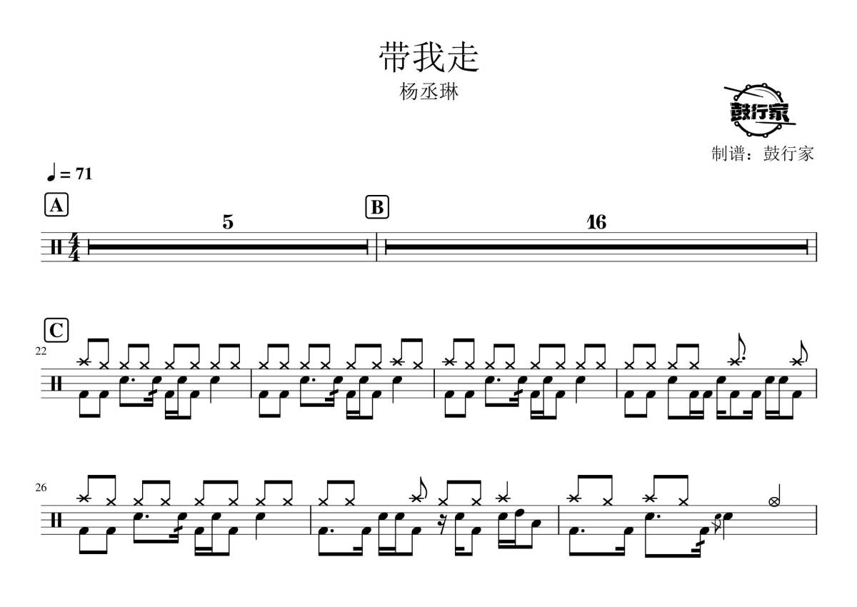 《带我走》是杨丞琳演唱的一首歌曲,拍号为4/4拍,歌曲速度为每分钟71拍,这份鼓谱共有两张高清图谱,图谱由 @鼓行家 编配上传,图谱使用五线谱编配,使用这份带我走架子鼓谱,你将能够轻松地敲打出这首杨丞琳的带我走,快来尝试吧。