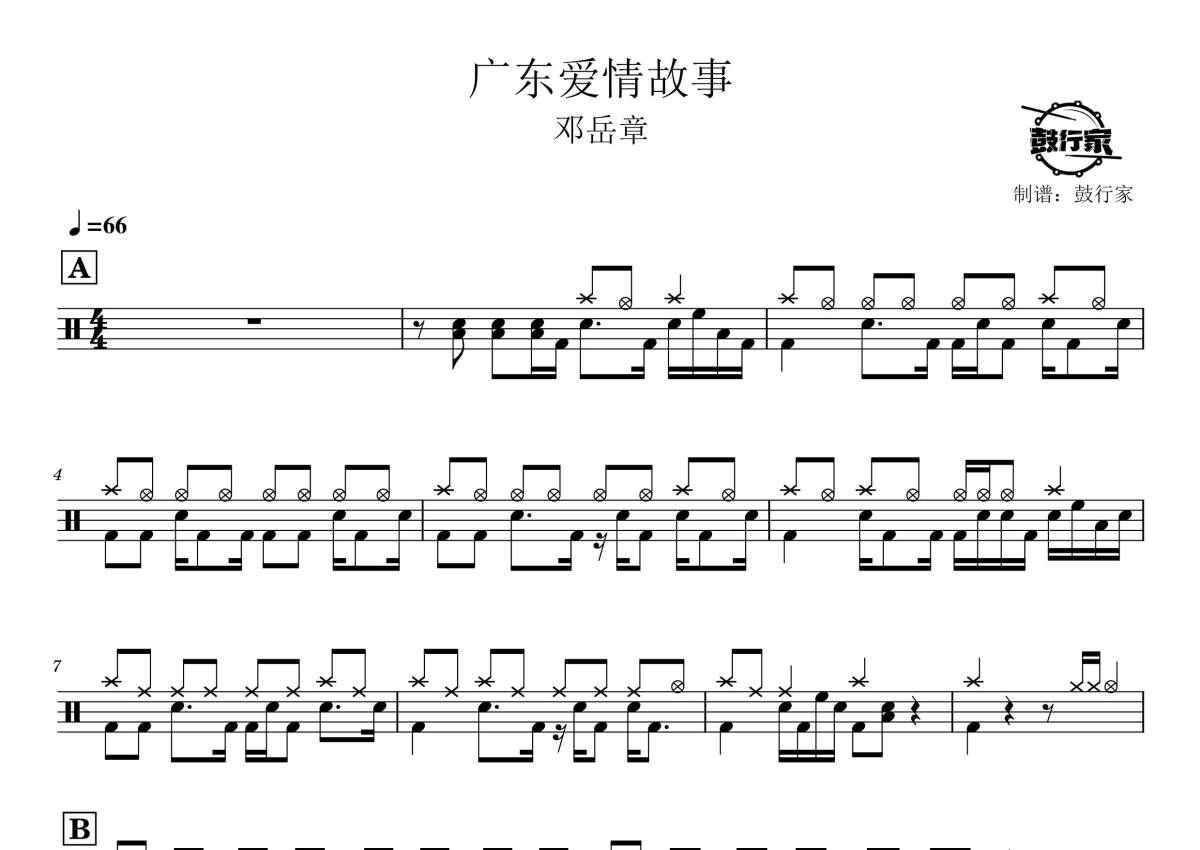 《广东爱情故事》是广东雨神演唱的一首歌曲,拍号为4/4拍,歌曲速度为每分钟66拍,这份鼓谱共有两张高清图谱,图谱由 @鼓行家 编配上传,图谱使用五线谱编配,使用这份广东爱情故事架子鼓谱,你将能够轻松地敲打出这首广东雨神的广东爱情故事,快来尝试吧。