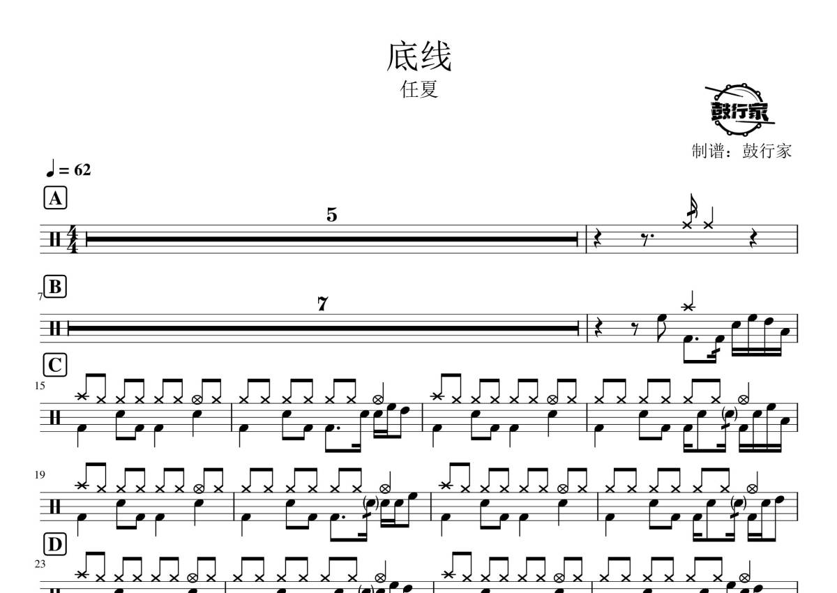 《底线》是任夏演唱的一首歌曲,拍号为4/4拍,歌曲速度为每分钟62拍,这份鼓谱共有一张高清图谱,图谱由 @鼓行家 编配上传,图谱使用五线谱编配,使用这份底线架子鼓谱,你将能够轻松地敲打出这首任夏的底线,快来尝试吧。