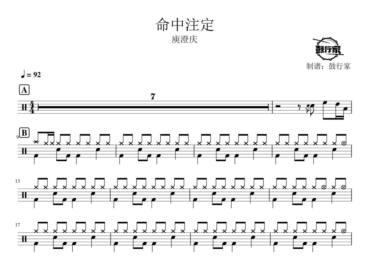 《命中注定》是庾澄庆演唱的一首歌曲,拍号为4/4拍,歌曲速度为每分钟92拍,这份鼓谱共有两张高清图谱,图谱由 @鼓行家 编配上传,图谱使用五线谱编配,使用这份命中注定架子鼓谱,你将能够轻松地敲打出这首庾澄庆的命中注定,快来尝试吧。