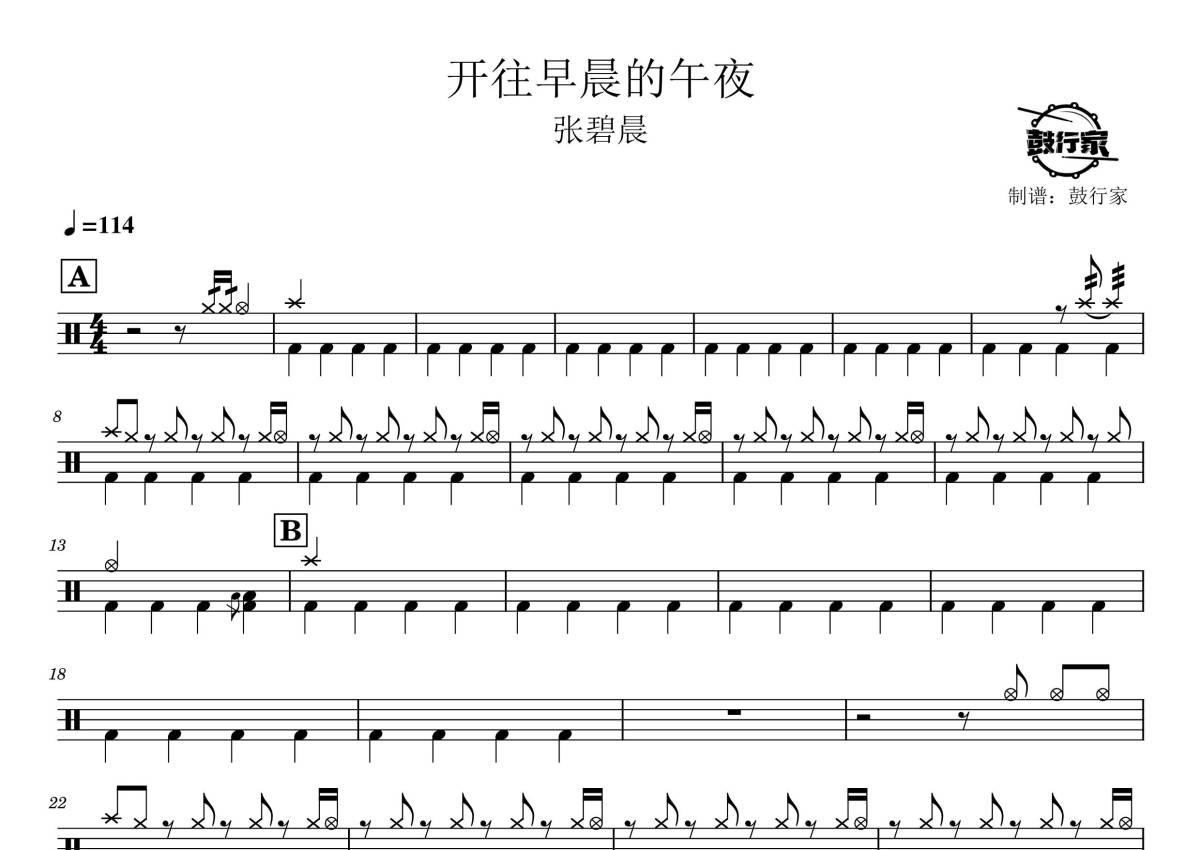 《开往早晨的午夜》是张碧晨演唱的一首歌曲,拍号为4/4拍,歌曲速度为每分钟114拍,这份鼓谱共有三张高清图谱,图谱由 @鼓行家 编配上传,图谱使用五线谱编配,使用这份开往早晨的午夜架子鼓谱,你将能够轻松地敲打出这首张碧晨的开往早晨的午夜,快来尝试吧。