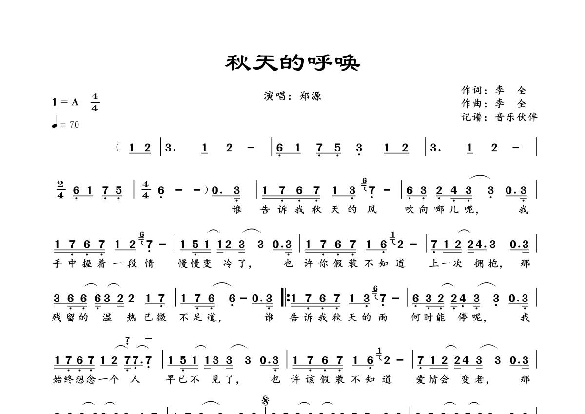 《秋天的呼唤》是郑源演唱的一首歌曲,拍号为4/4拍,歌曲速度为每分钟70拍,这份简谱共有一张高清图谱,图谱由 @音乐伙伴 编配上传。
