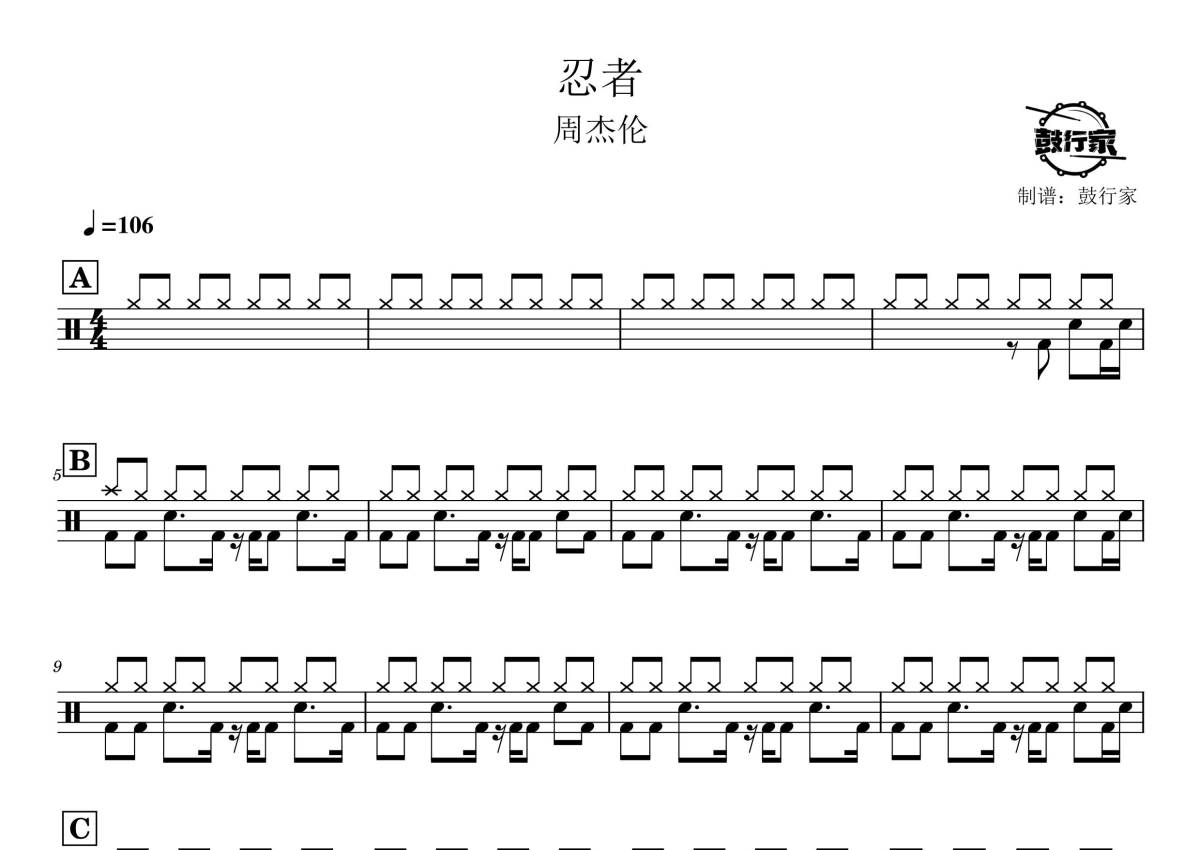 《忍者》是周杰伦演唱的一首歌曲,拍号为4/4拍,歌曲速度为每分钟106拍,这份鼓谱共有两张高清图谱,图谱由 @鼓行家 编配上传,图谱使用五线谱编配,使用这份忍者架子鼓谱,你将能够轻松地敲打出这首周杰伦的忍者,快来尝试吧。