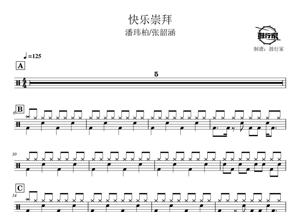 《快乐崇拜》是张韶涵 / 潘玮柏演唱的一首歌曲,拍号为4/4拍,歌曲速度为每分钟125拍,这份鼓谱共有三张高清图谱,图谱由 @鼓行家 编配上传,图谱使用五线谱编配,使用这份快乐崇拜架子鼓谱,你将能够轻松地敲打出这首张韶涵 / 潘玮柏的快乐崇拜,快来尝试吧。