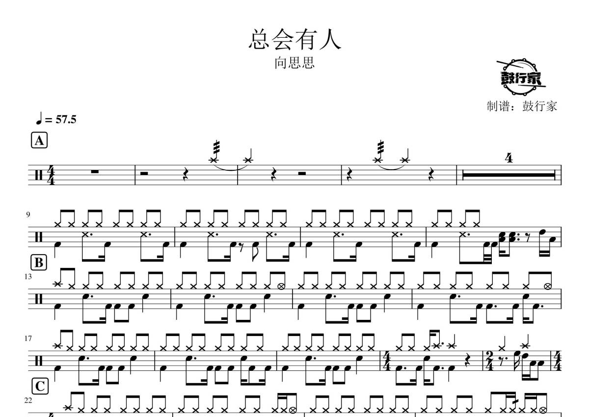 《总会有人》是向思思演唱的一首歌曲,拍号为4/4拍,歌曲速度为每分钟57.5拍,这份鼓谱共有一张高清图谱,图谱由 @鼓行家 编配上传,图谱使用五线谱编配,使用这份总会有人架子鼓谱,你将能够轻松地敲打出这首向思思的总会有人,快来尝试吧。