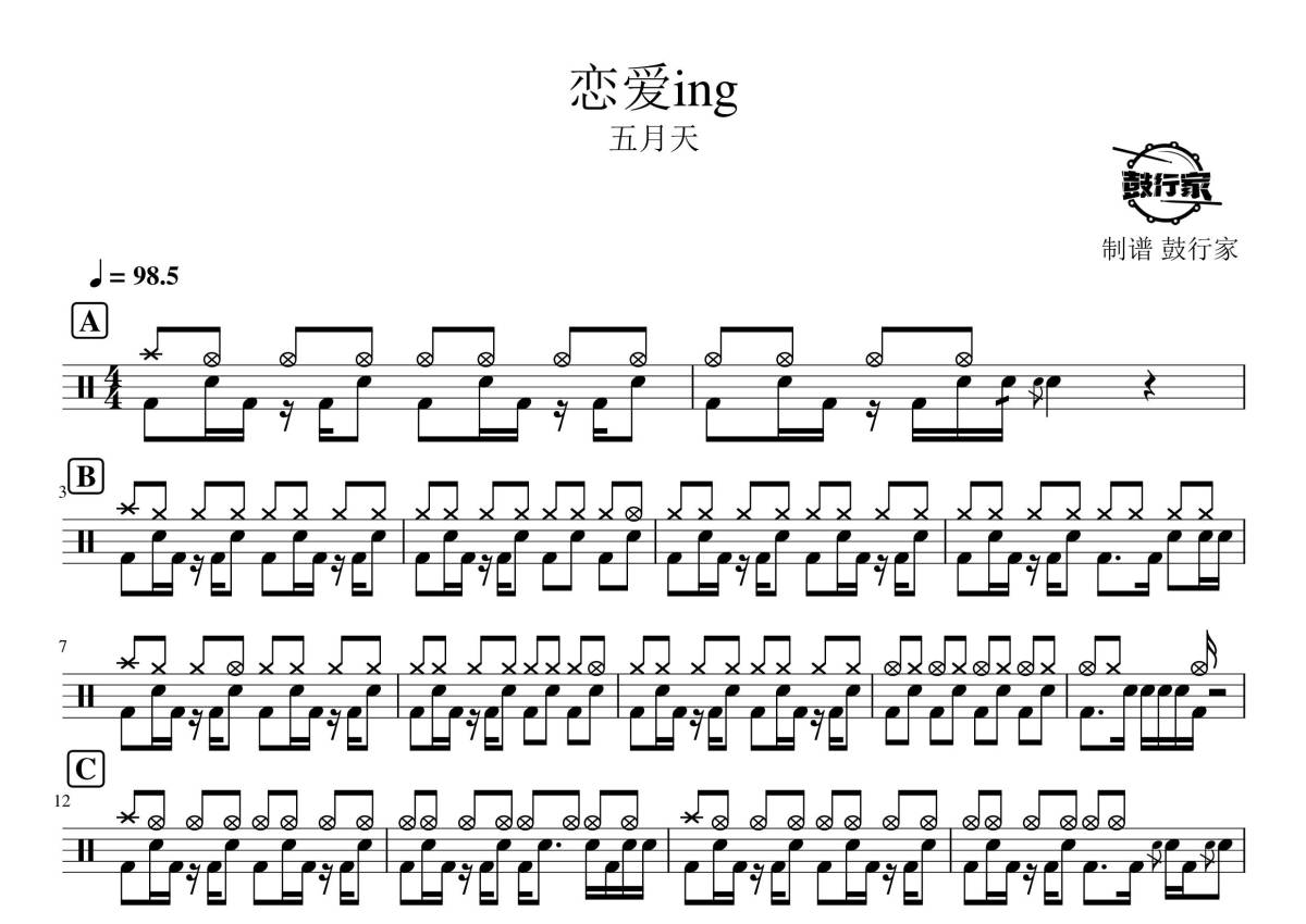 《恋爱ing》是五月天演唱的一首歌曲,拍号为4/4拍,歌曲速度为每分钟98.5拍,这份鼓谱共有两张高清图谱,图谱由 @鼓行家 编配上传,图谱使用五线谱编配,使用这份恋爱ing架子鼓谱,你将能够轻松地敲打出这首五月天的恋爱ing,快来尝试吧。