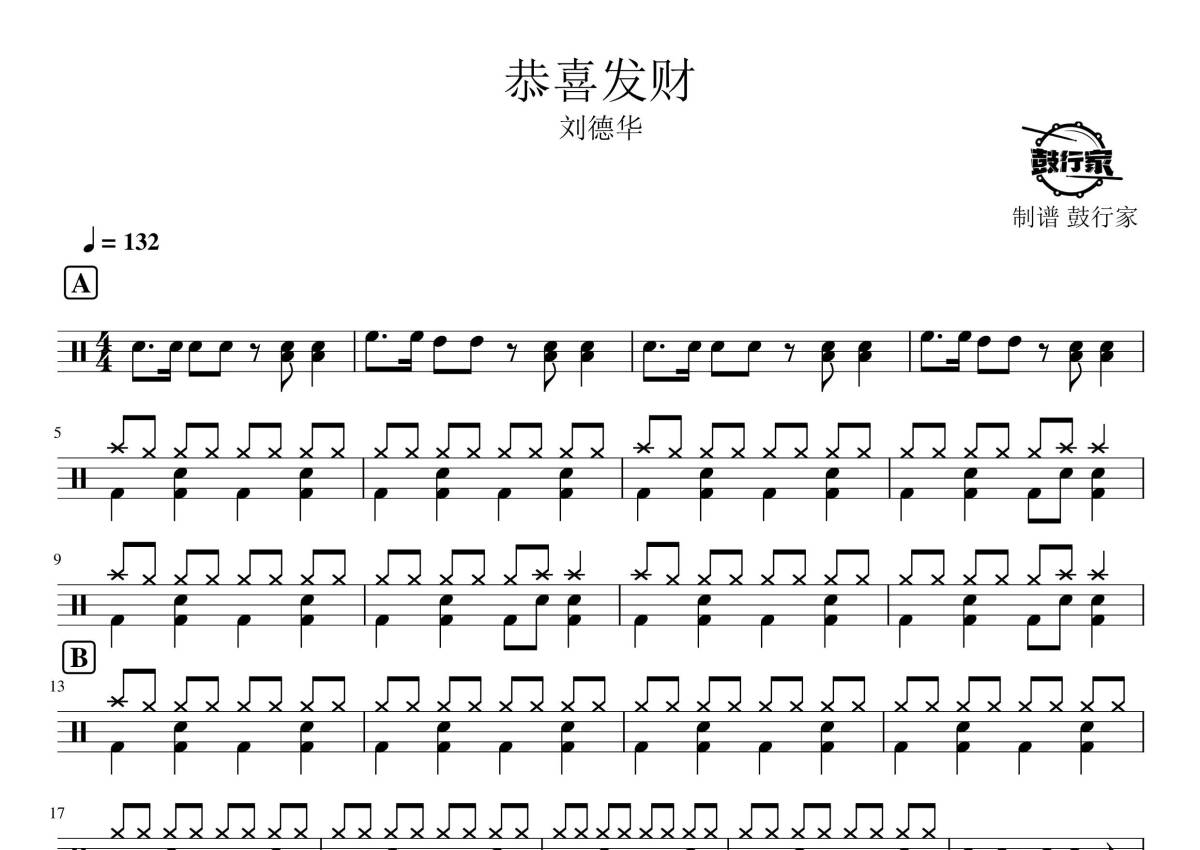 《恭喜发财》是刘德华演唱的一首歌曲,拍号为4/4拍,歌曲速度为每分钟132拍,这份鼓谱共有两张高清图谱,图谱由 @鼓行家 编配上传,图谱使用五线谱编配,使用这份恭喜发财架子鼓谱,你将能够轻松地敲打出这首刘德华的恭喜发财,快来尝试吧。