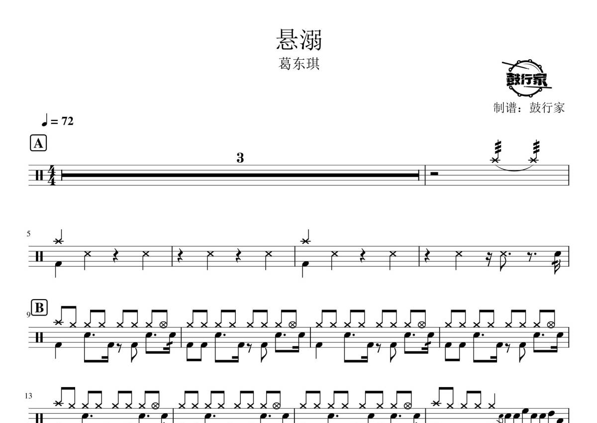《悬溺》是葛东琪演唱的一首歌曲,拍号为4/4拍,歌曲速度为每分钟72拍,这份鼓谱共有两张高清图谱,图谱由 @鼓行家 编配上传,图谱使用五线谱编配,使用这份悬溺架子鼓谱,你将能够轻松地敲打出这首葛东琪的悬溺,快来尝试吧。
