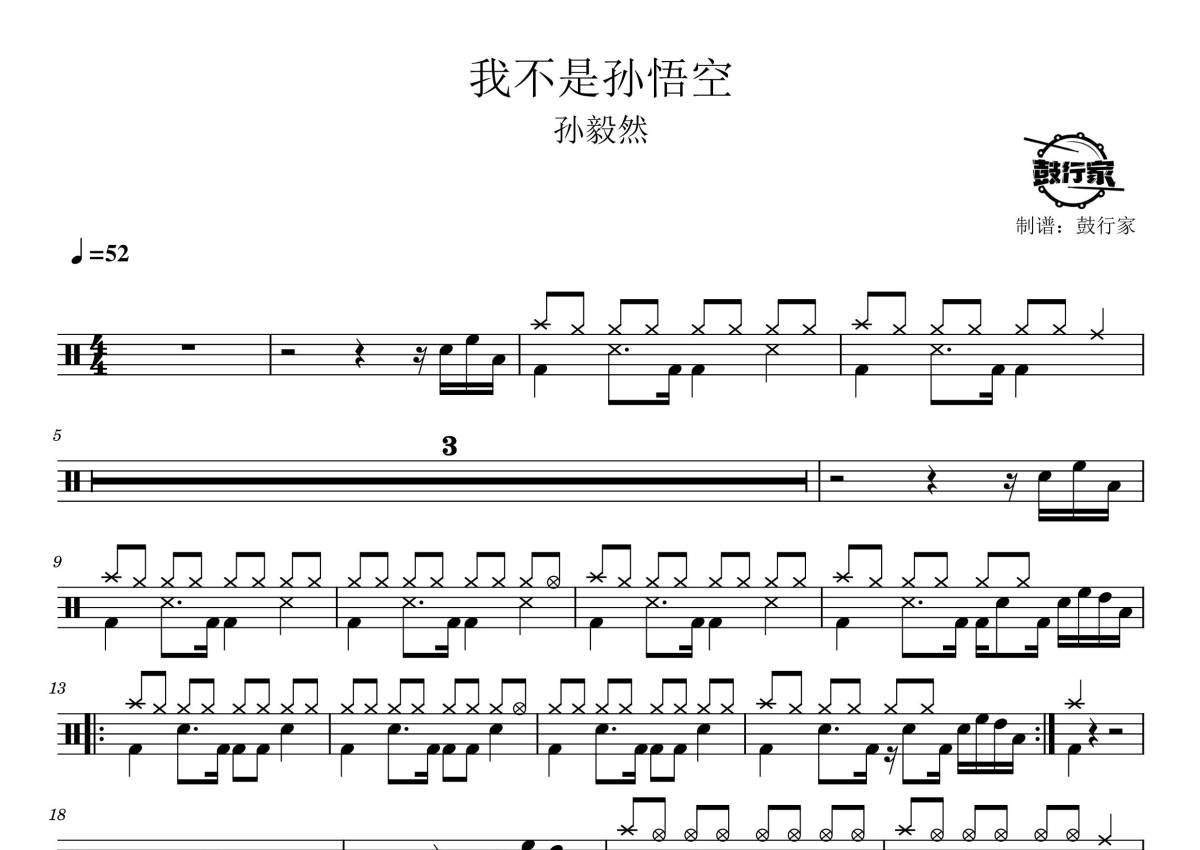 《我不是孙悟空》是孙毅然演唱的一首歌曲,拍号为4/4拍,歌曲速度为每分钟52拍,这份鼓谱共有一张高清图谱,图谱由 @鼓行家 编配上传,图谱使用五线谱编配,使用这份我不是孙悟空架子鼓谱,你将能够轻松地敲打出这首孙毅然的我不是孙悟空,快来尝试吧。
