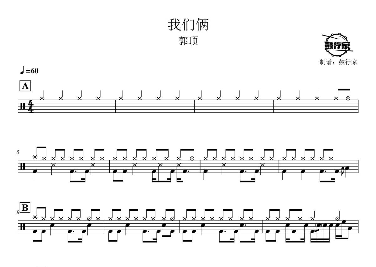 《我们俩》是郭顶演唱的一首歌曲,拍号为4/4拍,歌曲速度为每分钟60拍,这份鼓谱共有两张高清图谱,图谱由 @鼓行家 编配上传,图谱使用五线谱编配,使用这份我们俩架子鼓谱,你将能够轻松地敲打出这首郭顶的我们俩,快来尝试吧。