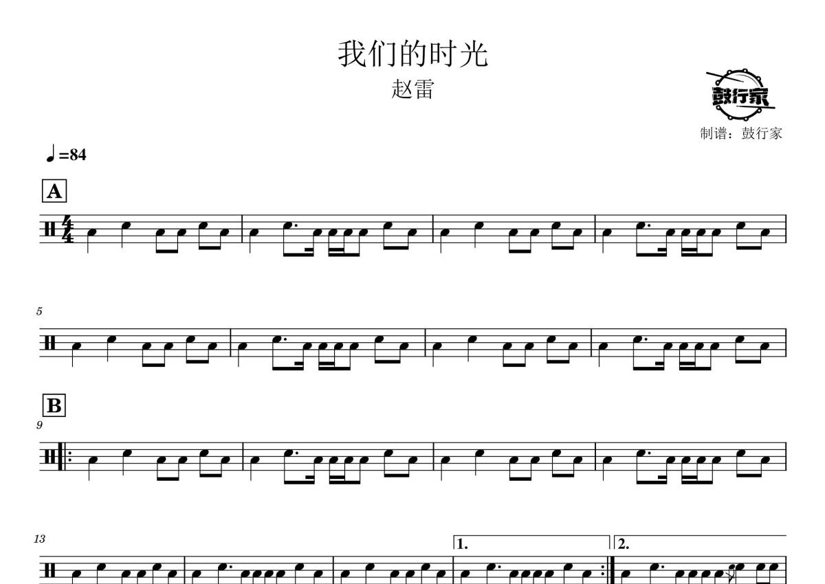 《我们的时光》是赵雷演唱的一首歌曲,拍号为4/4拍,歌曲速度为每分钟84拍,这份鼓谱共有两张高清图谱,图谱由 @鼓行家 编配上传,图谱使用五线谱编配,使用这份我们的时光架子鼓谱,你将能够轻松地敲打出这首赵雷的我们的时光,快来尝试吧。