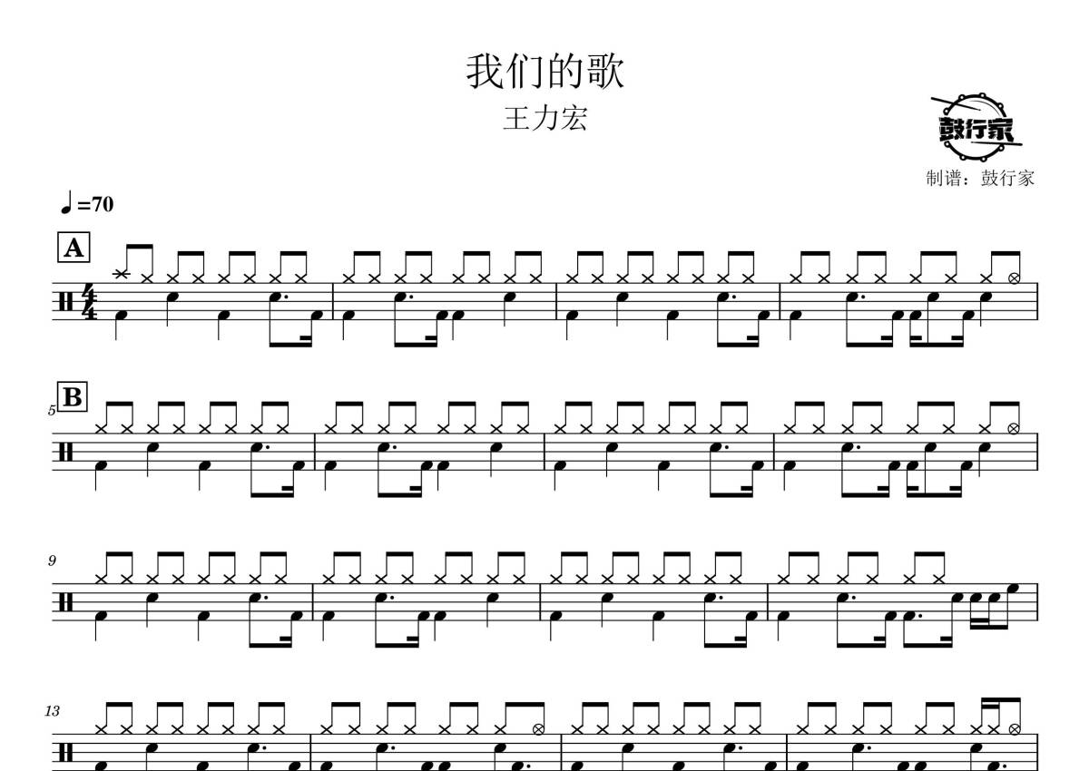 《我们的歌》是王力宏演唱的一首歌曲,拍号为4/4拍,歌曲速度为每分钟70拍,这份鼓谱共有两张高清图谱,图谱由 @鼓行家 编配上传,图谱使用五线谱编配,使用这份我们的歌架子鼓谱,你将能够轻松地敲打出这首王力宏的我们的歌,快来尝试吧。