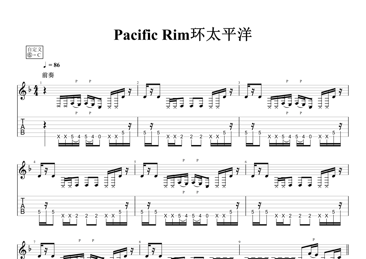 《Pacific Rim》是环太平洋主题曲演唱的一首歌曲,石头音乐原版记谱,拍号为4/4拍,歌曲速度为每分钟86拍,歌曲原调为F调,演奏时不需要使用变调夹即为原调,这份电吉他谱共有七张高清图谱,图谱由 @石头音乐 编配上传,图谱使用六线谱编配,曲谱配备了相关的音频提供试听,使用这份Pacific Rim电吉他谱,可以让你更加方便地掌握这首歌曲的演奏技巧,快来尝试吧。只需要调一根弦就可以完美完成音符,不用特意再买个七弦吉他了!有solo和GTP文件方便打印。
