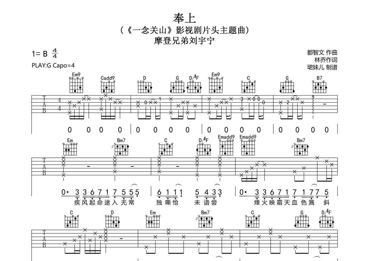 《奉上》是摩登兄弟刘宇宁演唱的一首歌曲,拍号为4/4拍,歌曲速度为每分钟85拍,歌曲原调为G调,本吉他谱采用的是G调指法编配,变调夹4品弹奏即为原调,当然也可以根据自己的音域改变变调夹位置,或者通过改变和弦调性,以方便自己弹奏,这份吉他谱共有两张高清图谱,图谱由 @珺妹儿 编配上传,图谱使用六线谱编配,包含吉他和弦指法、简谱以及歌词部分,使用这份奉上吉他谱,可以让你更加方便地掌握这首歌曲的弹唱技巧,快来尝试吧。