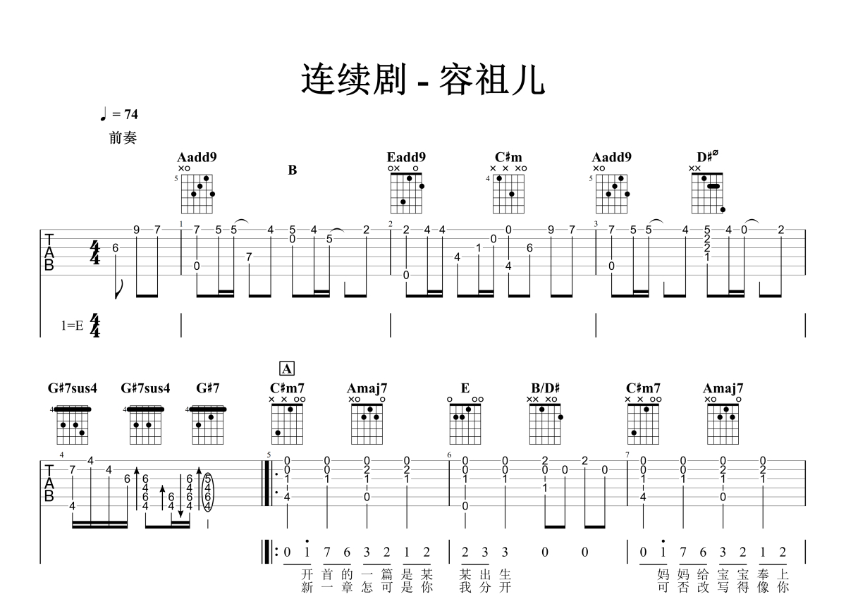 《连续剧》是容祖儿演唱的一首歌曲,石头音乐原版记谱,拍号为4/4拍,歌曲速度为每分钟74拍,歌曲原调为E调,但由于原调指法比较难,为了方便弹奏,本吉他谱采用的是E调指法编配,演奏时不需要使用变调夹即为原调,这份吉他谱共有三张高清图谱,图谱由 @石头音乐 编配上传,图谱使用六线谱编配,包含吉他和弦指法、简谱以及歌词部分,曲谱配备了相关的音频提供试听,使用这份连续剧吉他谱,可以让你更加方便地掌握这首歌曲的弹唱技巧,快来尝试吧。