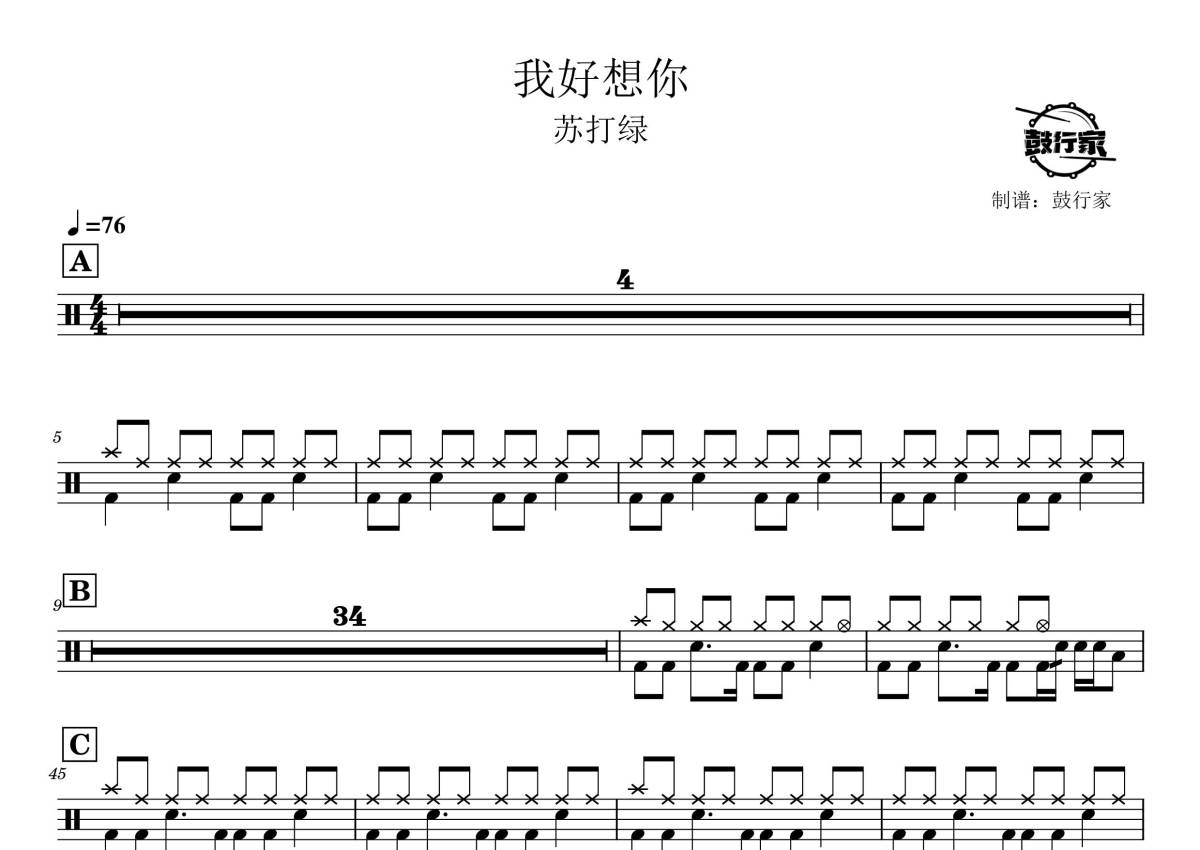 《我好想你》是苏打绿演唱的一首歌曲,拍号为4/4拍,歌曲速度为每分钟76拍,这份鼓谱共有两张高清图谱,图谱由 @鼓行家 编配上传,图谱使用五线谱编配,使用这份我好想你架子鼓谱,你将能够轻松地敲打出这首苏打绿的我好想你,快来尝试吧。