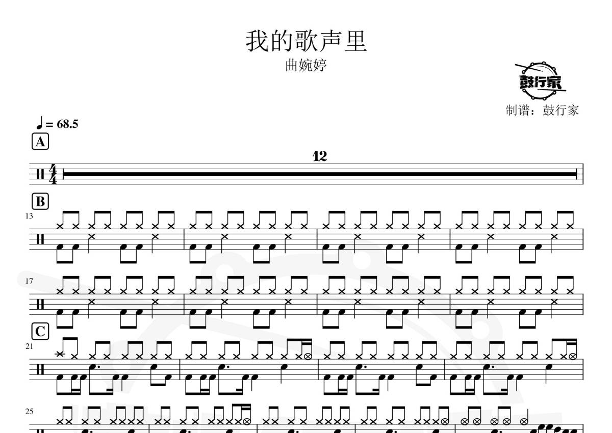《我的歌声里》是曲婉婷演唱的一首歌曲,拍号为4/4拍,歌曲速度为每分钟68.5拍,这份鼓谱共有一张高清图谱,图谱由 @鼓行家 编配上传,图谱使用五线谱编配,使用这份我的歌声里架子鼓谱,你将能够轻松地敲打出这首曲婉婷的我的歌声里,快来尝试吧。