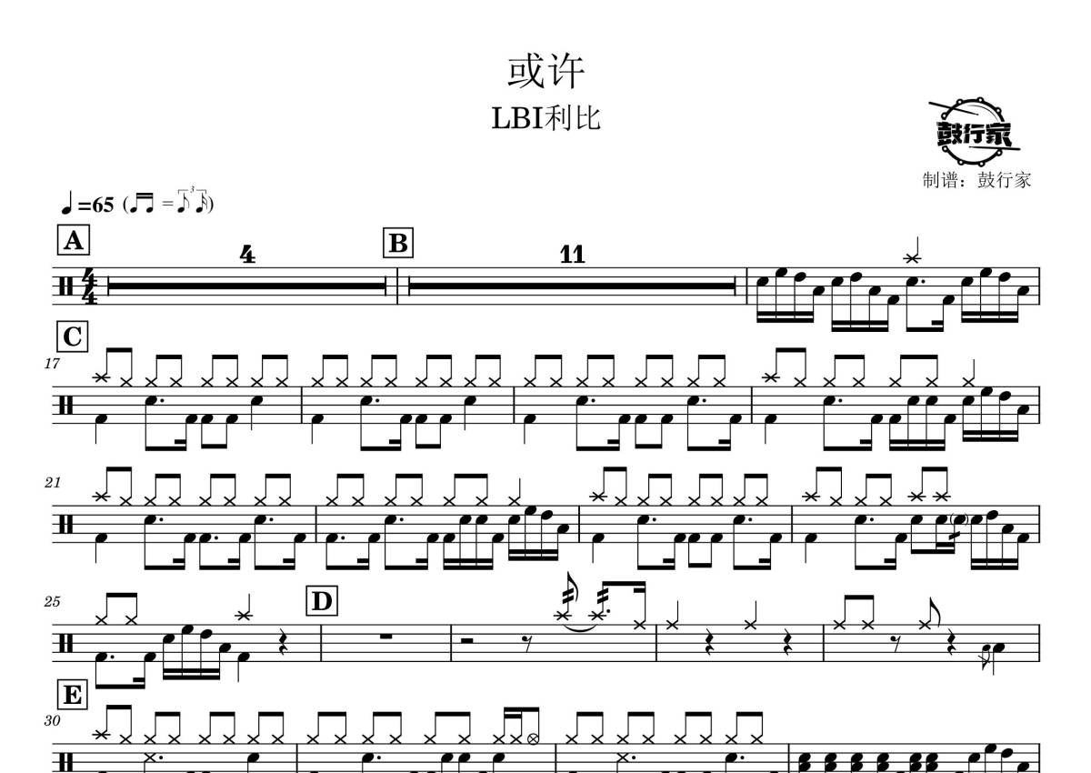 《或许》是LBI利比演唱的一首歌曲,拍号为4/4拍,歌曲速度为每分钟65拍,这份鼓谱共有一张高清图谱,图谱由 @鼓行家 编配上传,图谱使用五线谱编配,使用这份或许架子鼓谱,你将能够轻松地敲打出这首LBI利比的或许,快来尝试吧。