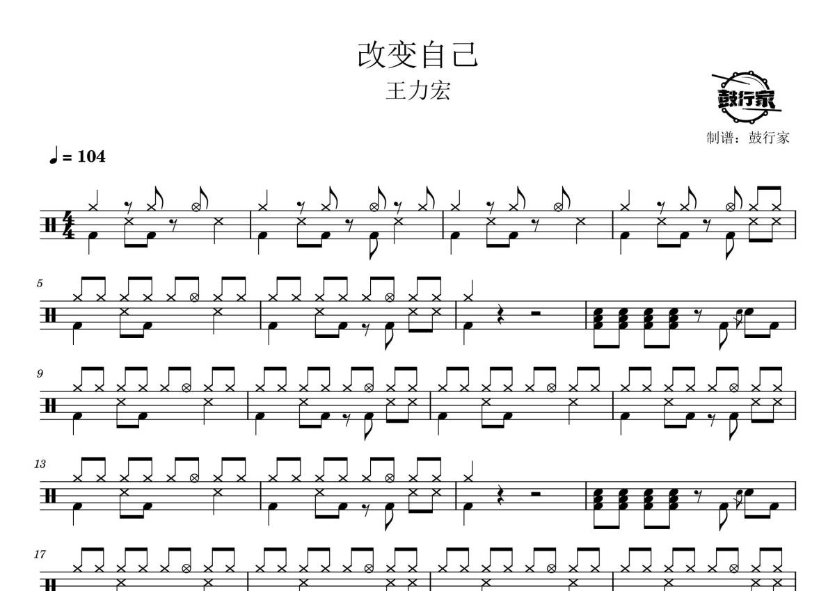 《改变自己》是王力宏演唱的一首歌曲,拍号为4/4拍,歌曲速度为每分钟104拍,这份鼓谱共有两张高清图谱,图谱由 @鼓行家 编配上传,图谱使用五线谱编配,使用这份改变自己架子鼓谱,你将能够轻松地敲打出这首王力宏的改变自己,快来尝试吧。