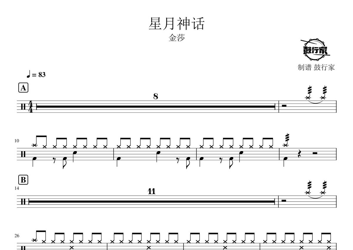 《星月神话》是金莎演唱的一首歌曲,拍号为4/4拍,歌曲速度为每分钟83拍,这份鼓谱共有两张高清图谱,图谱由 @鼓行家 编配上传,图谱使用五线谱编配,使用这份星月神话架子鼓谱,你将能够轻松地敲打出这首金莎的星月神话,快来尝试吧。